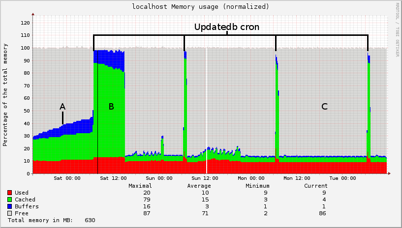 - (Point C) That’s how the actual daily usage pattern of this machine looks like. The Cached/Buffers memory cache is heavily underused on my system, as it doesn’t do much I/O work. This wouldn’t be visible if I don’t clear the cache every hour.
