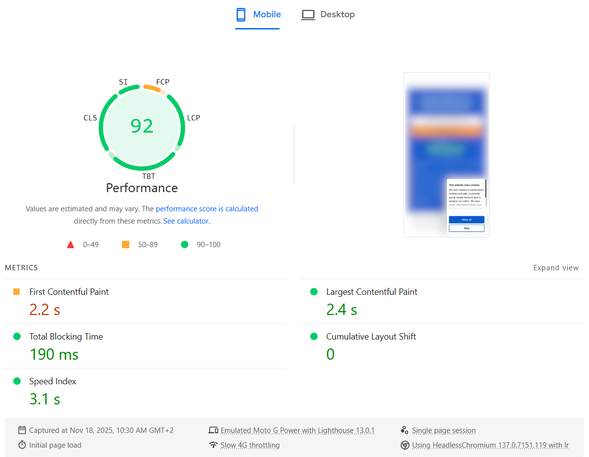 The strange part: in reality, the website still felt just as fast as before — including the Cookiebot banner. Everything appeared quickly, and users wouldn’t notice any slowdown. It felt like Lighthouse was “wrong”: it was measuring something that didn’t match the actual user experience.