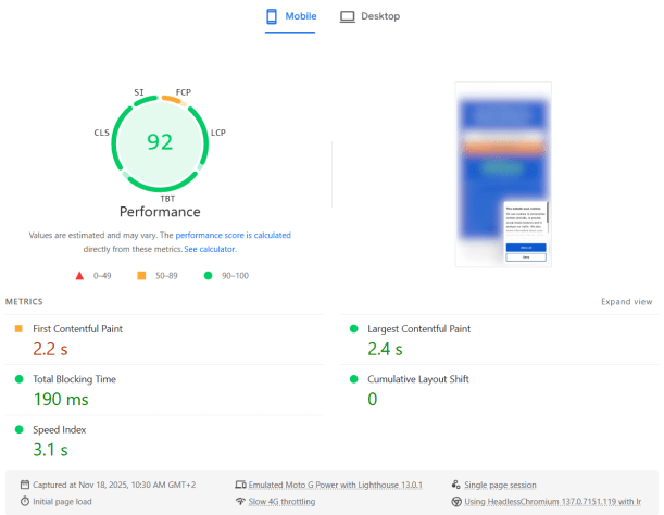 After applying the CSS, the PageSpeed Insights report improved immediately: the LCP metric went back to a healthy value and the overall Mobile Performance score returned to green.