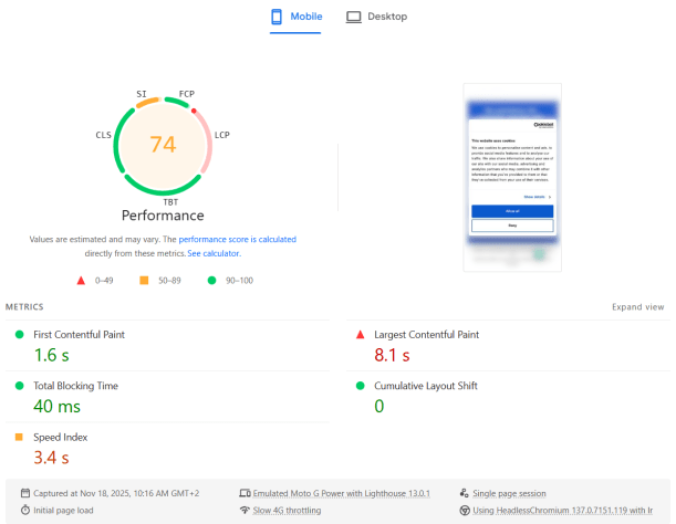 - As a result, LCP is reported as very slow — even though visually the page looks complete very quickly.